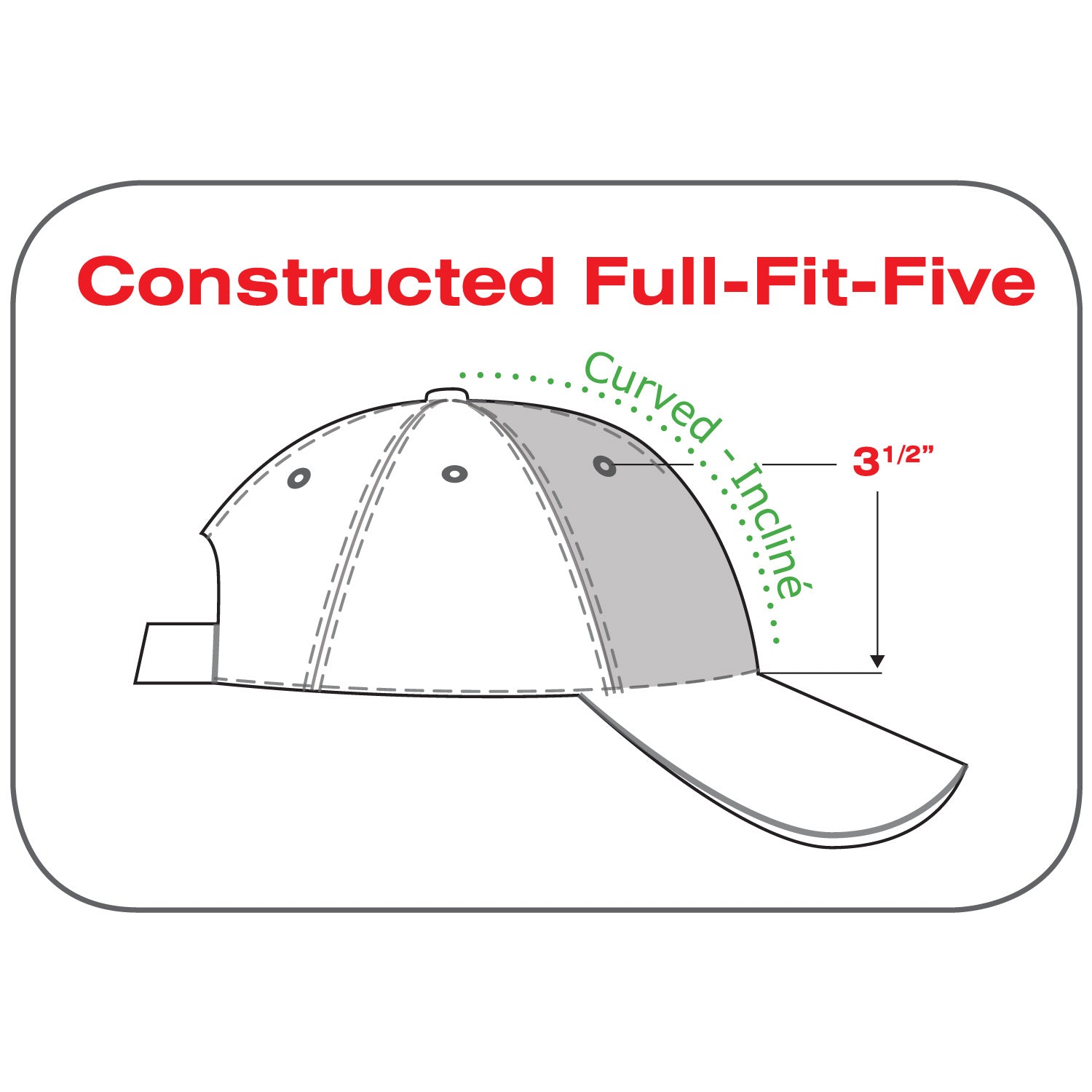 – 5 Reinforced “Full-Fit-Five” Panels (Rear Mesh, Women) – Laminated buckram front panel and “Pro” stitching – Pre-curved pallet with 6 rows of stitching (P1) – Opening for ponytail between the 2 rear sections – Adjustable plastic rear clip (S1)